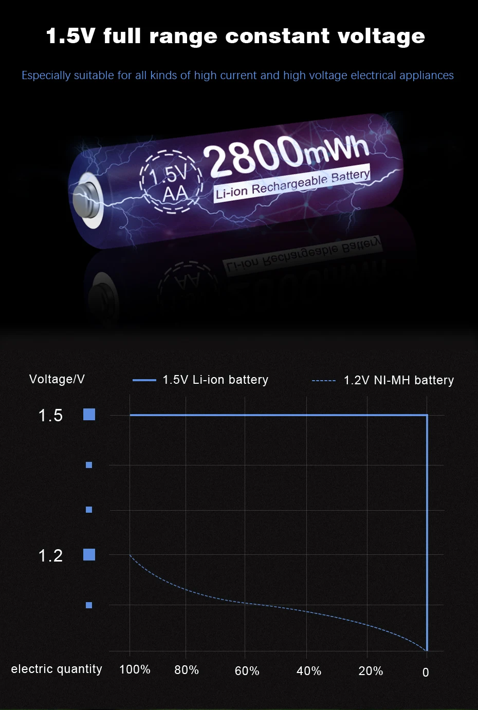 1. 1.5v Constant voltage,higher than the 1.2v nickel-metal hydride battery