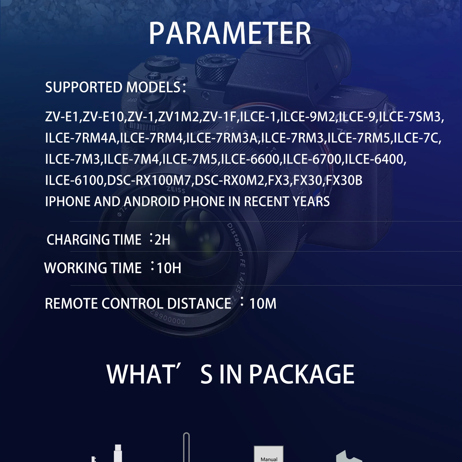 Sony compatible models:A6100、A6400、A6600、A6700、A1、A7M3、A7RM3、A7SM3、A7M4、A7RM4、A7R3、A7R4、A7RM5、A7C、A7CR、A7CII、A9、A9M2 、A9M3、FX3、FX30、 FX30B、RX0M2、RX100M7、ZV1、ZV1F、ZV1M2、ZV-E10、ZV-E1