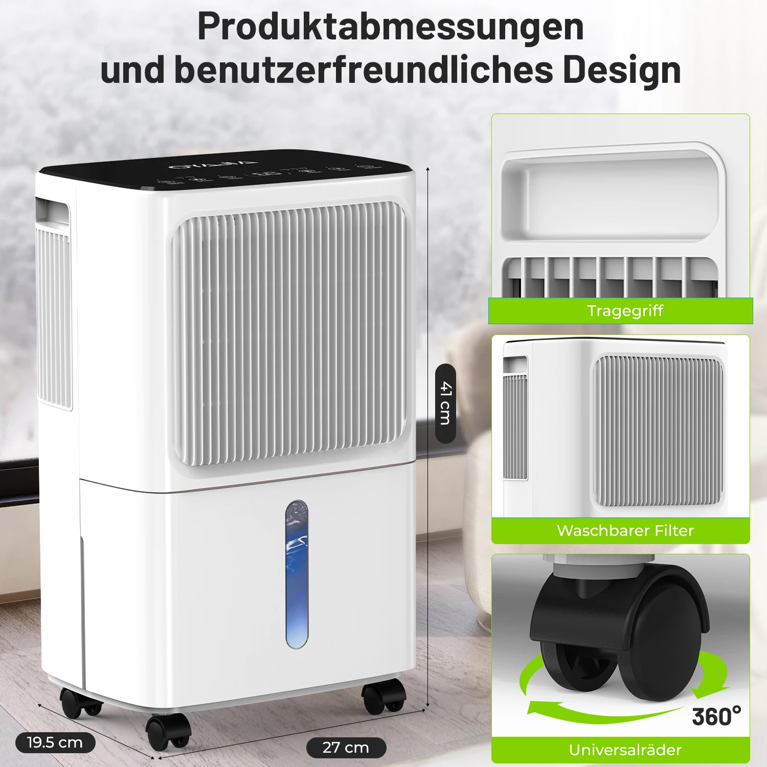 Portable & eco-friendly: Thanks to the smooth 360° swivel wheels and a handle on the back, the dehumidifier can be easily moved from one room to another. The refrigerant R290 does not harm the ozone layer or contribute to the greenhouse effect.