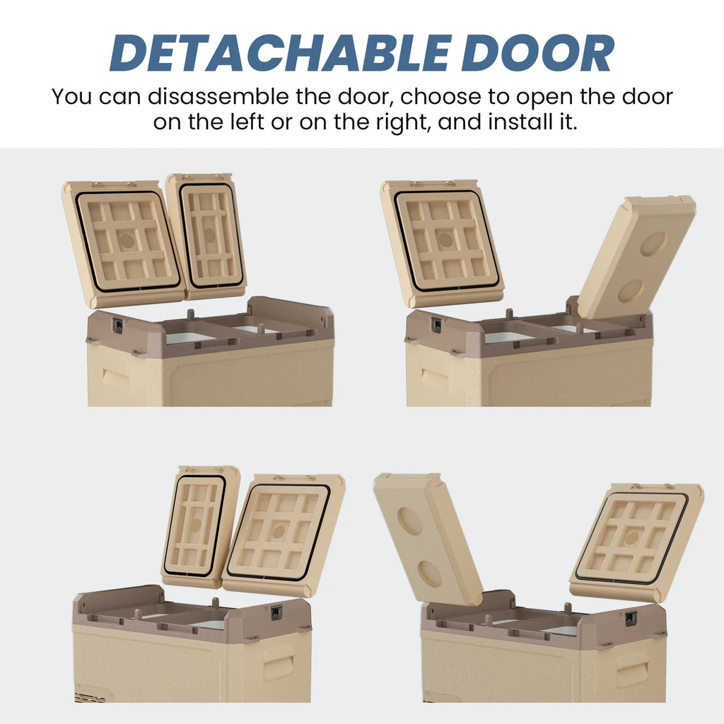 The fridge door can be detached and repositioned, making it easier to access food and drinks while driving or at a campsite.